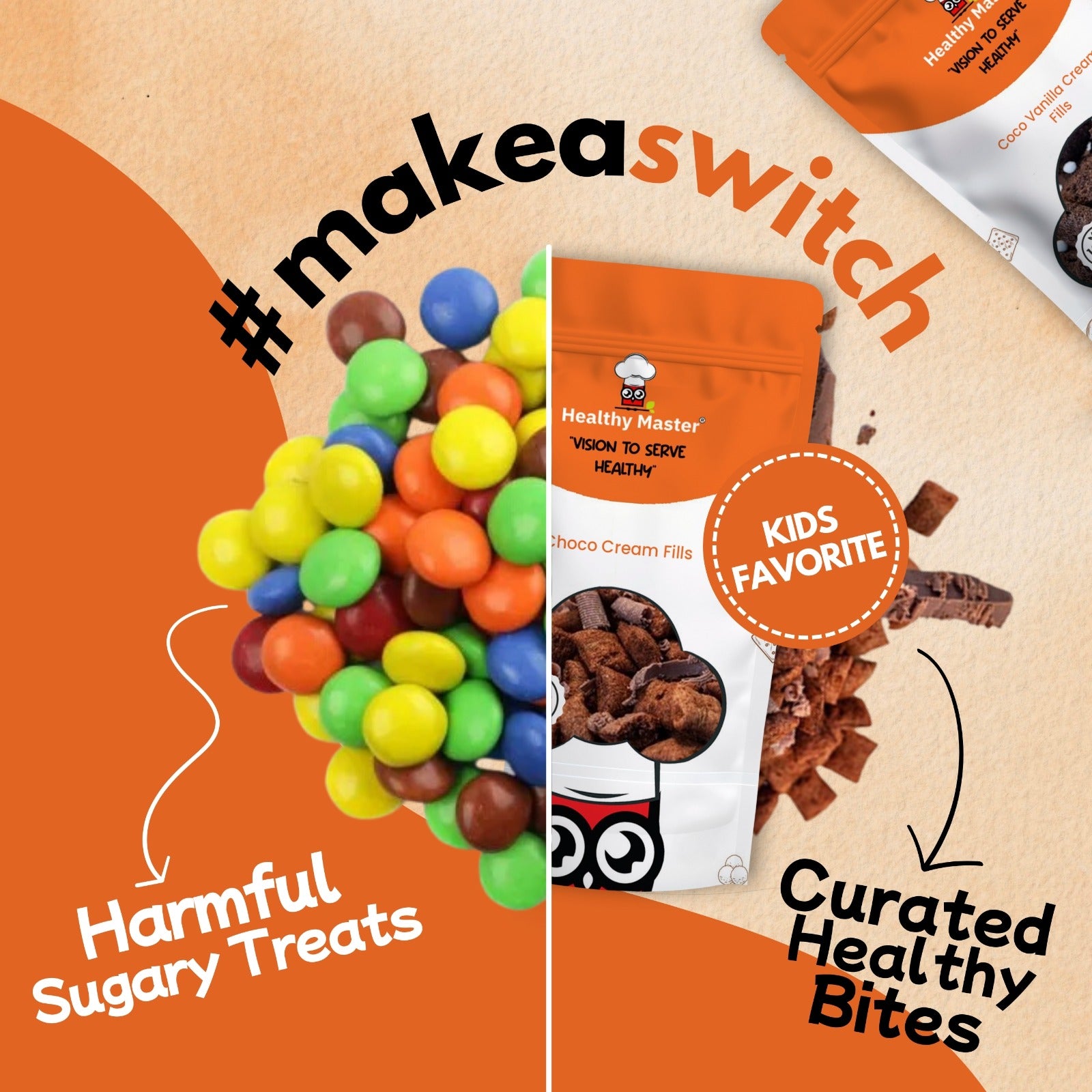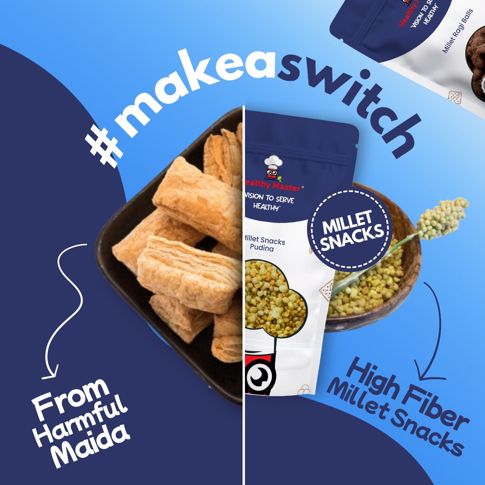 Some of the most popular and healthy snacks to buy from Healthy Master include roasted fox nuts (makhana), baked bhakarwadi, millet cookies, and sugar-free energy bars. All snacks are nutritionist-approved and full of natural goodness.
