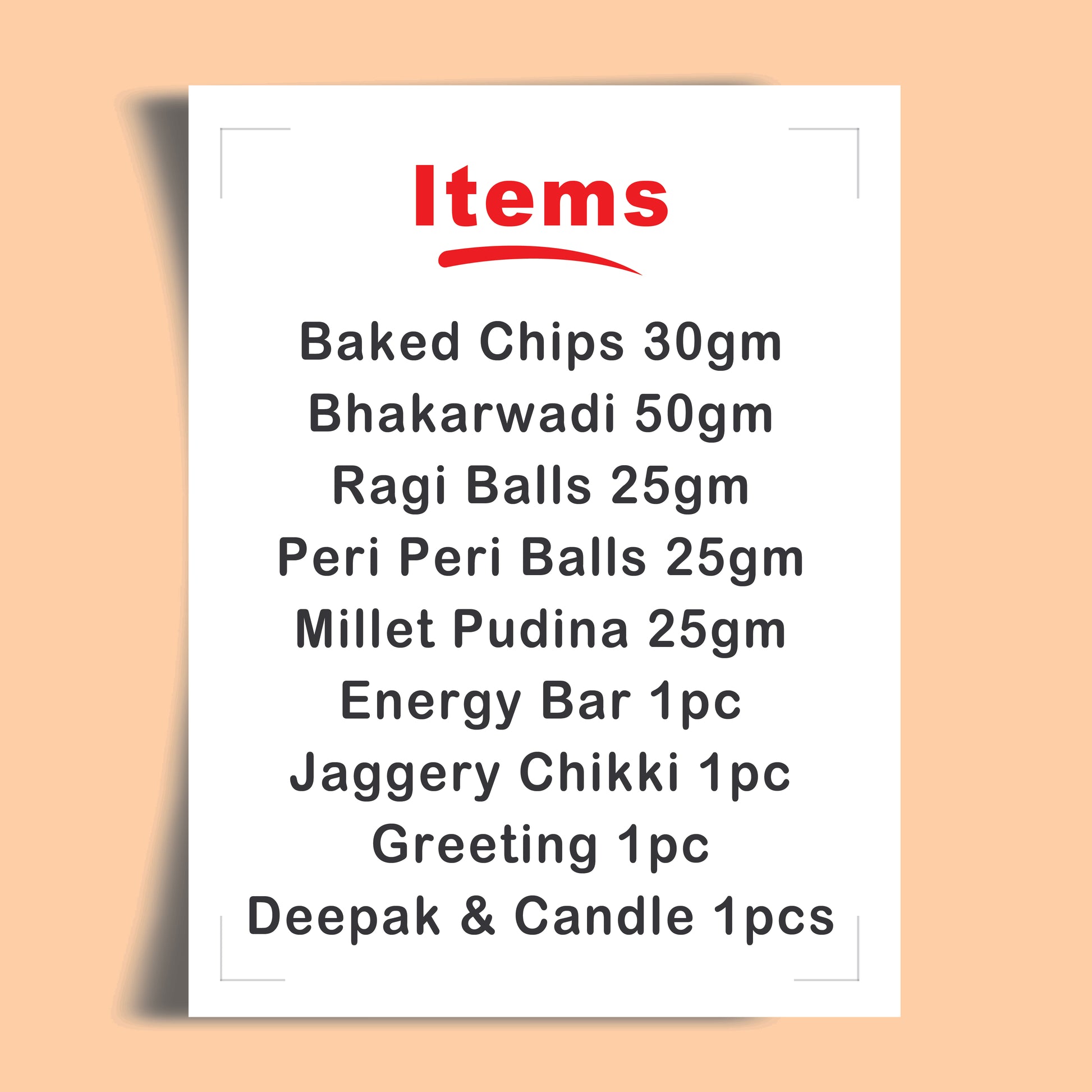 The Opulent Gift Set 1 is a luxurious blend of festive treats and healthy snacks, thoughtfully curated to enhance your Diwali celebrations. This elegant gift box includes nutritious baked chips, bhakarwadi, ragi balls, peri peri balls, millet pudina, energy bar and jaggery chikki. It's a perfect combination of tradition and modern wellness. Ideal for sharing with family, friends, or colleagues, the Opulent Gift Set 1 reflects the joy of giving while also promoting health and well-being during the festive season.