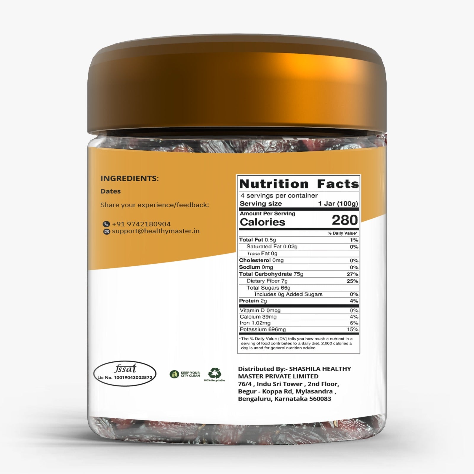 1)What is the storage and Shelf life of Dates? Once opened, pack dates in an airtight container and refrigerate to extend their shelf life for up to 6 months. 2)How many Dates can be eaten a day? It is recommended to consume up to 2 dates per day 3)Can Diabetics consume Dates? Yes, diabetics can consume dates, but limiting intake to just one date per day is advised. 4)What is the best time and how dates can be consumed? Soak dates overnight and the best time to eat them is morning on an empty stomach. It can be included in Milkshakes to gain strength and increase hemoglobin 5)Any extra sugar added? No, dates do not have any extra sugar added to them.