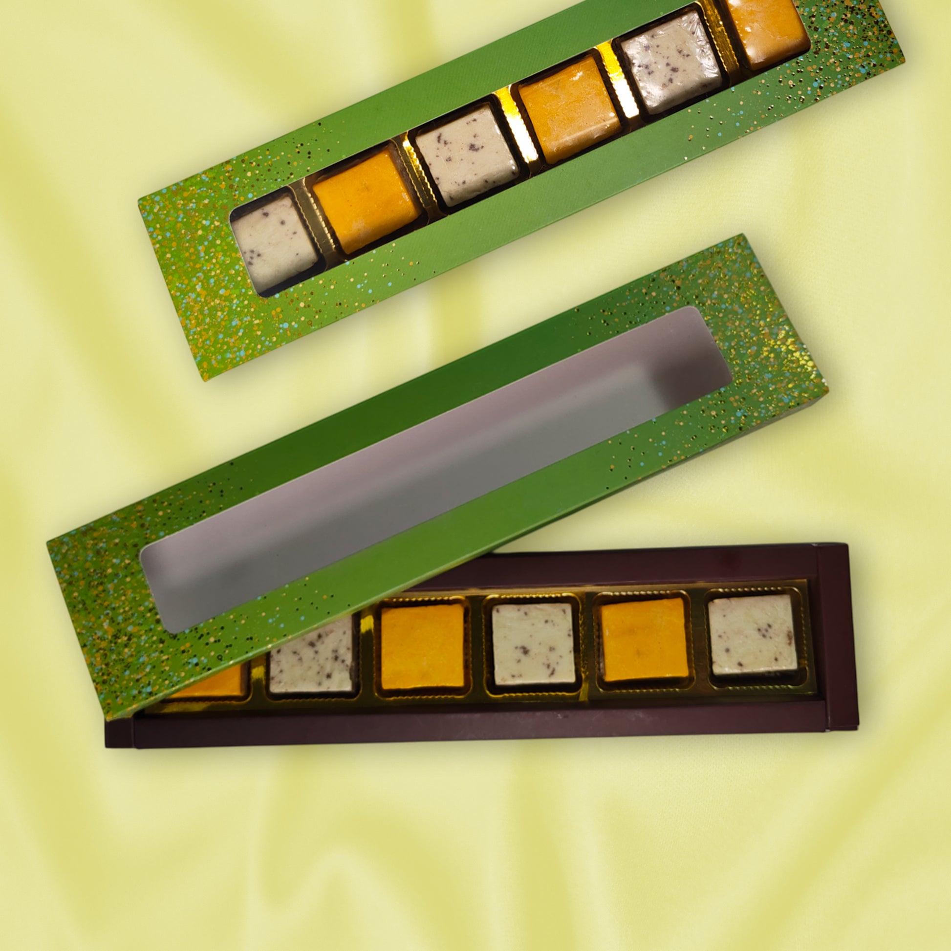 Three chocolate bites offer an otherworldly explosion of sunshine, but three chocolate bites. While the other 3 offer comforting hominess. Each bite of this chocolate is a small blessing to be relished.
