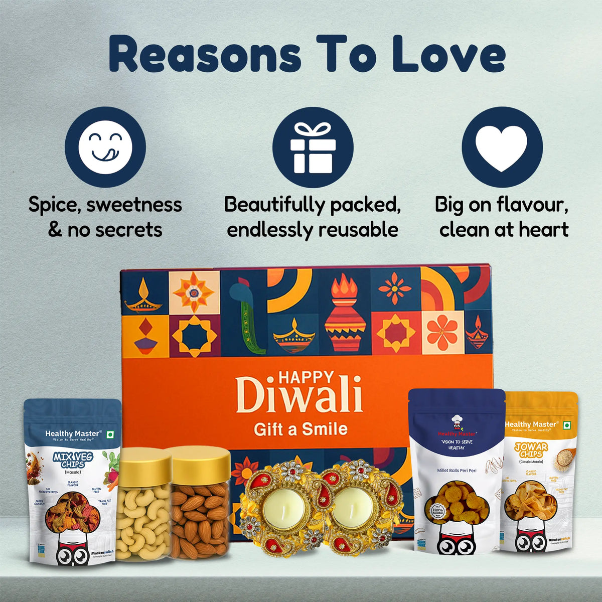 This Diwali, gift a perfect balance of taste, tradition, and wellness with the Crunch of Goodness Box. Thoughtfully curated to spread festive cheer, this hamper brings together wholesome snacks, premium dry fruits, and beautifully crafted Diyas – making it a delightful gift for family, friends, and colleagues.