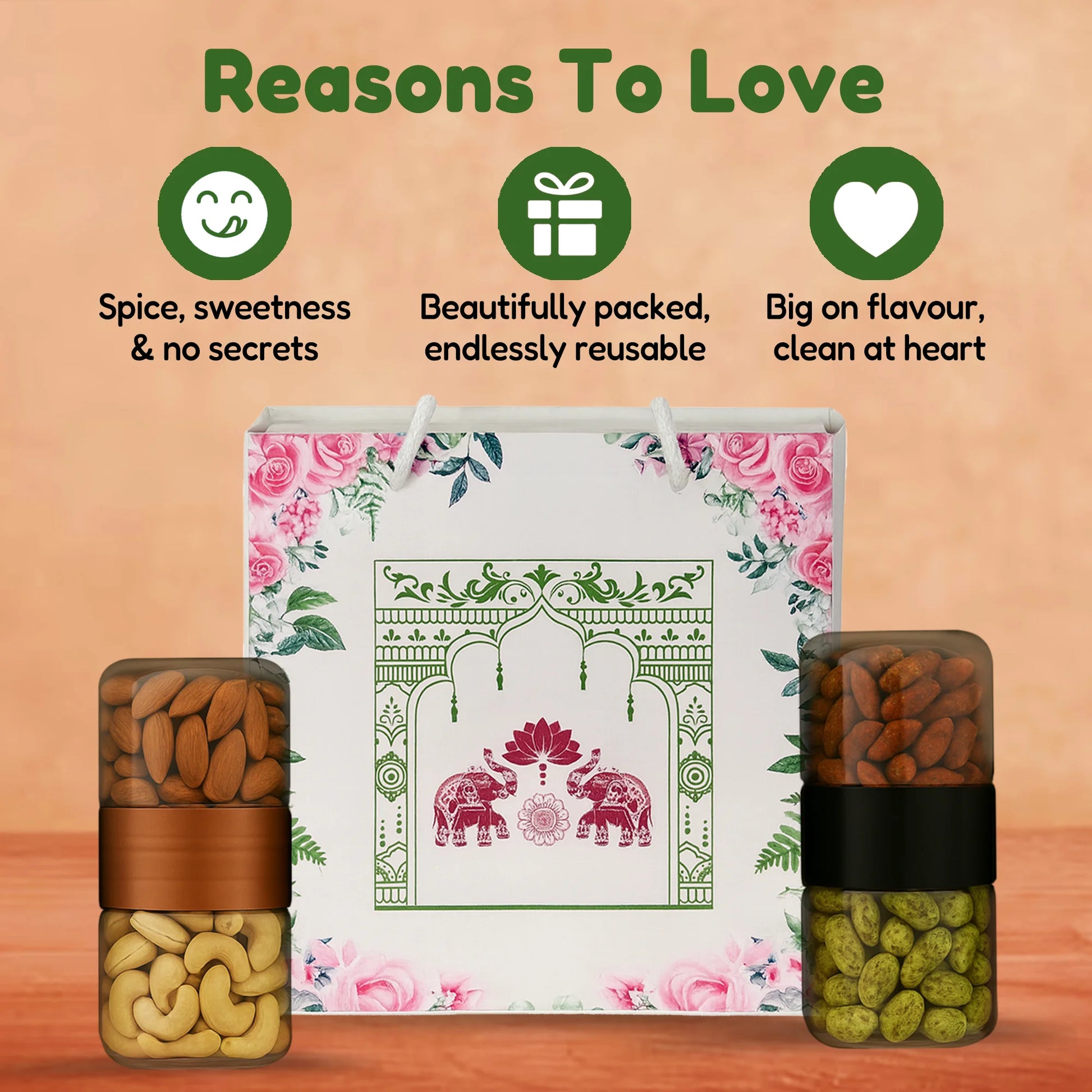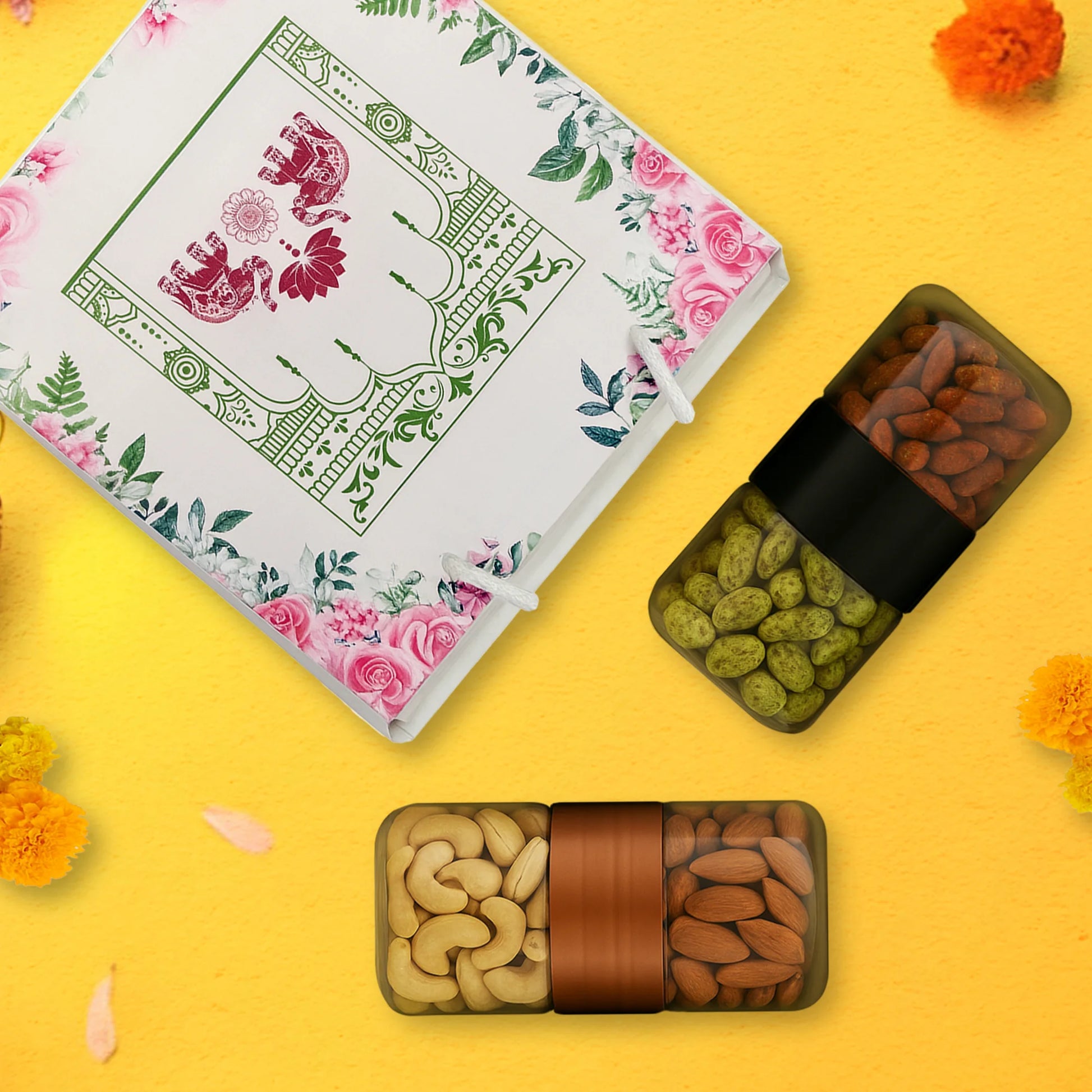 Our products are sourced and crafted with the highest quality standards to ensure a delightful and satisfying experience. Our snacks, dry fruits, nuts, and seeds are not only delicious but also nutritious, promoting a healthier lifestyle. Personalize your Diwali gift to your liking with our wide range of customizable options, including add-ons and greeting cards. Enhance your Diwali celebrations with our festive additions like candles, diyas, and lights, creating a warm and joyful atmosphere. Our Diwali gifts are perfect for expressing your love and best wishes to friends, family, and colleagues, making them feel truly special. We offer corporate gifting options, making it easy for businesses to share the spirit of Diwali with their clients, partners, and employees. Our user-friendly website allows you to browse, select, and order Diwali gifts with ease, ensuring a hassle-free shopping experience. We strive to deliver your Diwali gifts promptly, ensuring they reach your loved ones in time for the festivities.Benefits of Choosing Our Diwali Products: