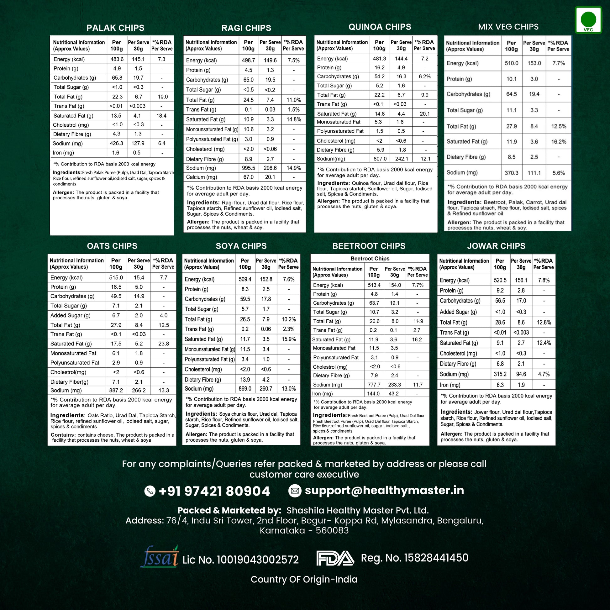 Healthy Snacks Combo consists 1) Ragi Chips 100gm 2) Quinoa Chips 100gm 3) Oats Chips 100gm 4) Palak Chips 100gm 5) Beetroot Chips 100gm 6) Soya Chips 100gm 7) Jowar Chips 100gm 8) Mix Veg Chips 100gm