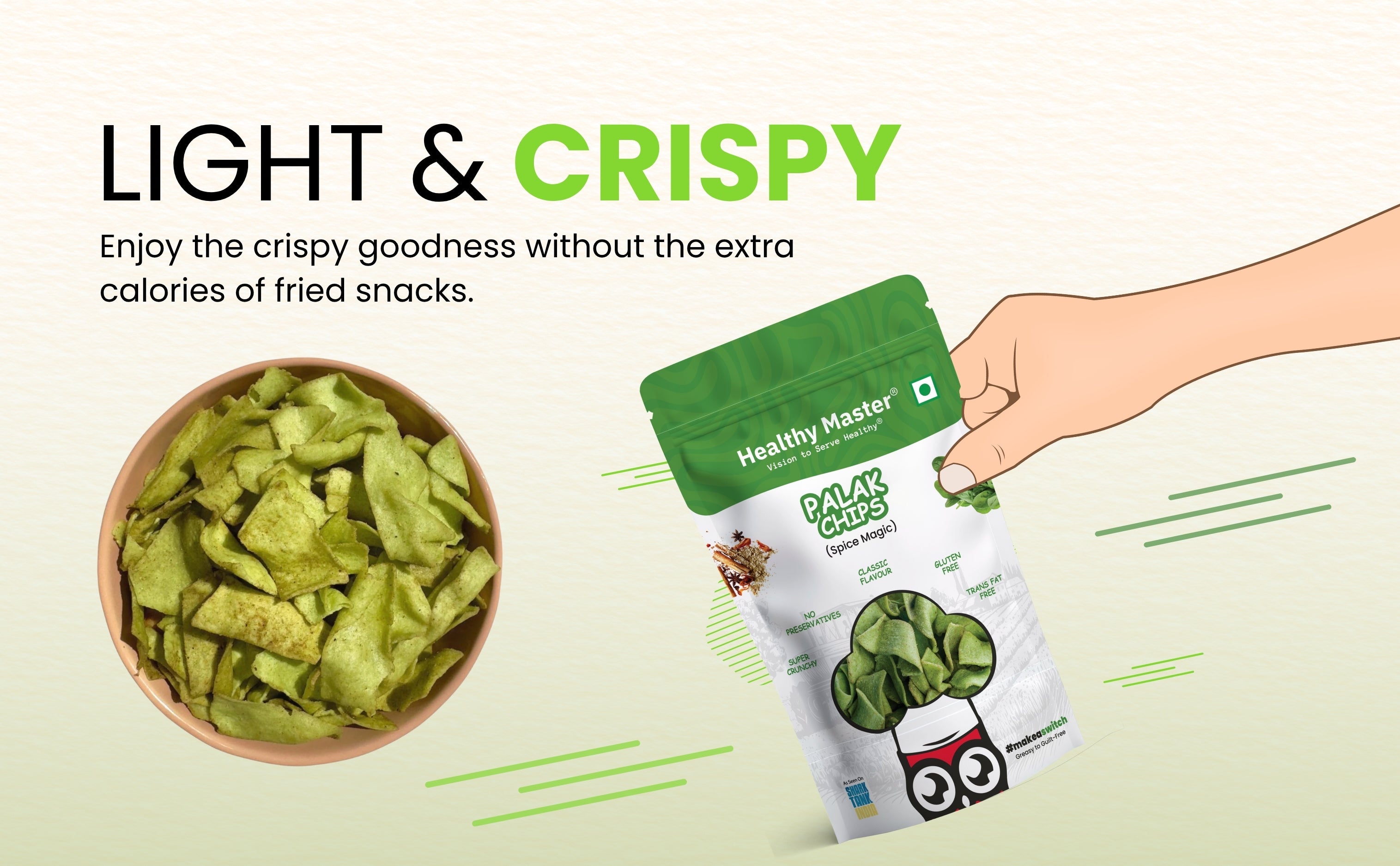 These chips are healthy and an excellent substitute for people who are diet conscious. Also, it has high nutritional value as compared to normal chips which makes these palak chips a super health snack choice. Light and Crispy Palak Chips are a tasty and healthy snack. High in protein, vitamins, and iron, Light and Crispy Chips are a great alternative to other chips. Buy Palak Chips Online from the healthy master.
