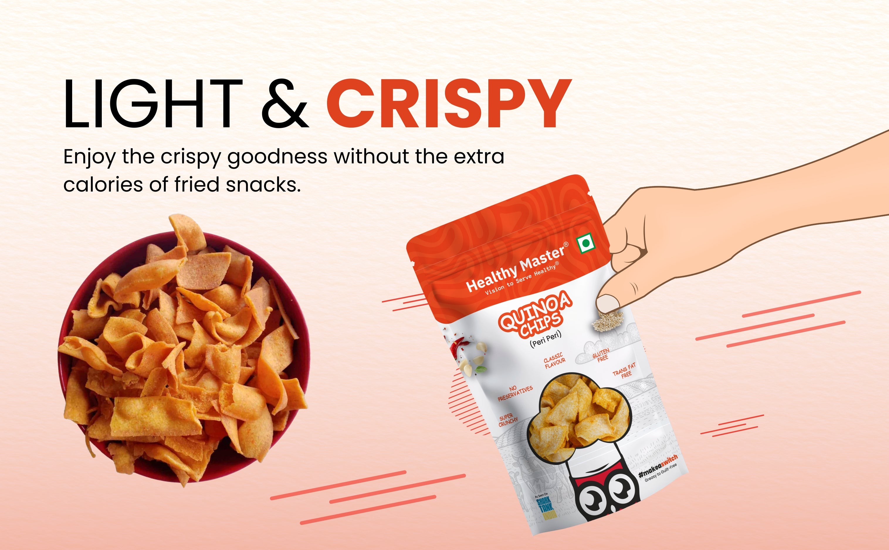 Buy Light and Crispy Quinoa Chips provide a healthier and lower caloric option than other snack foods, such as potato or corn chips. Light and Crispy Quinoa Chips can be store for long periods of time, and are easily digestible. These chips have great taste and minimal salt content which makes it a perfect snack for health-conscious individuals. Buy Quinoa chips in India from Healthy Master.