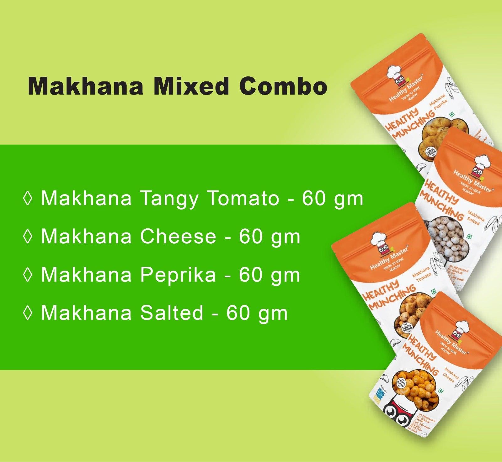 This healthy makhana combo consists of: 1) Makhana Tangy Tomato - 60 gm 2) Makhana Chesse - 60 gm 3) Makhana Peprika - 60 gm 4) Makhana Salted - 60 gm
